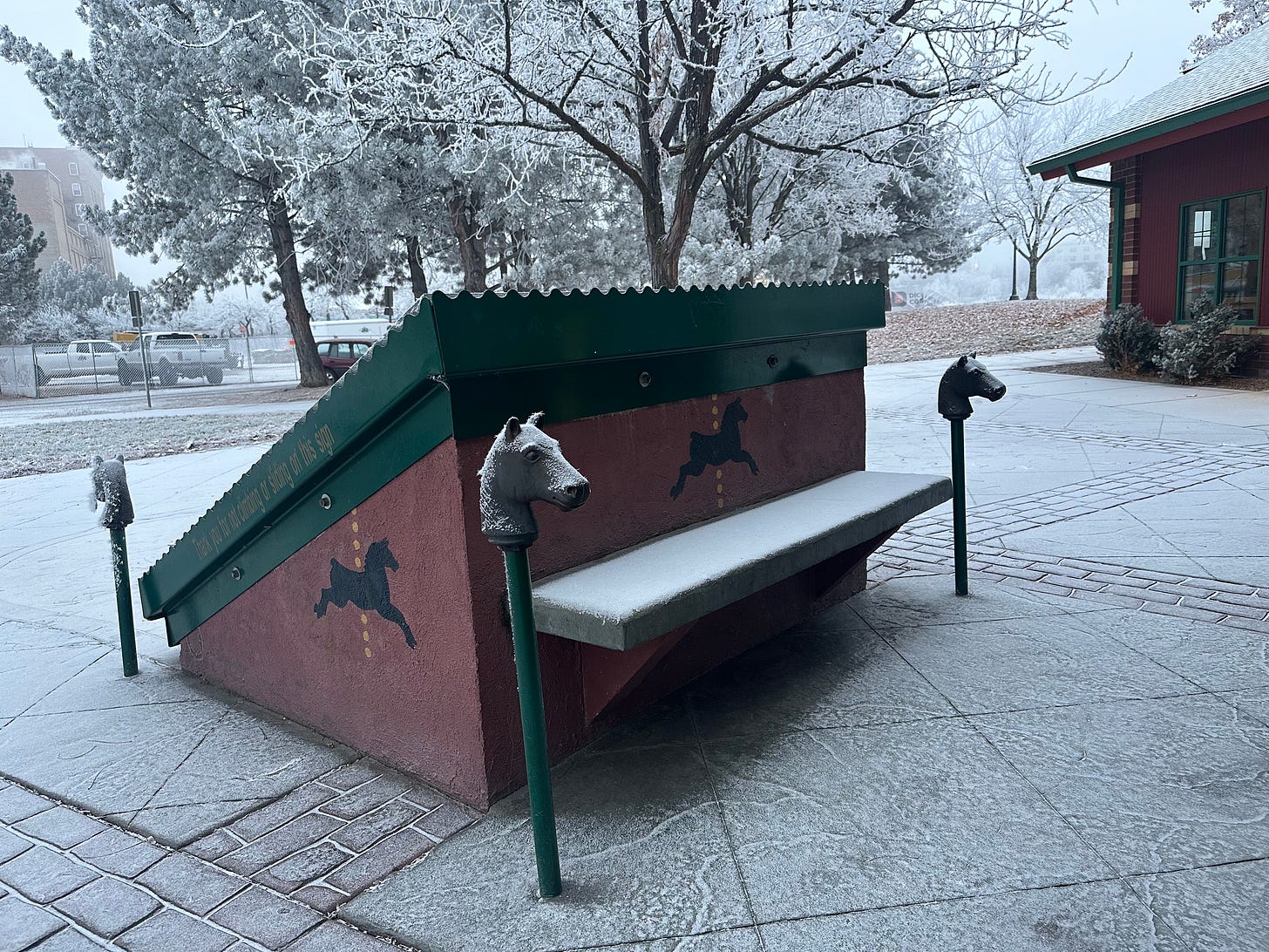 The frosts found Missoula again. An easy target, I suppose. But ambling about on one December day, on the backside of a sign indicating the history of Missoula’s Carousel (out of frame), guardianed by horse poles, is a hidden ledge of a bench. By itself, a simple seat, oriented in a way that whomever rests could watch the carousel horses orbit. What’s far more impressive and endearing than this bench is the story of the carousel itself. How Missoula cabinet-maker Chuck Kaparich told the Missoula City Council “If you will give it a home, and promise no one will ever take it apart, I will build A Carousel for Missoula.” How fundraising began and a community came together. Their website tells it well: