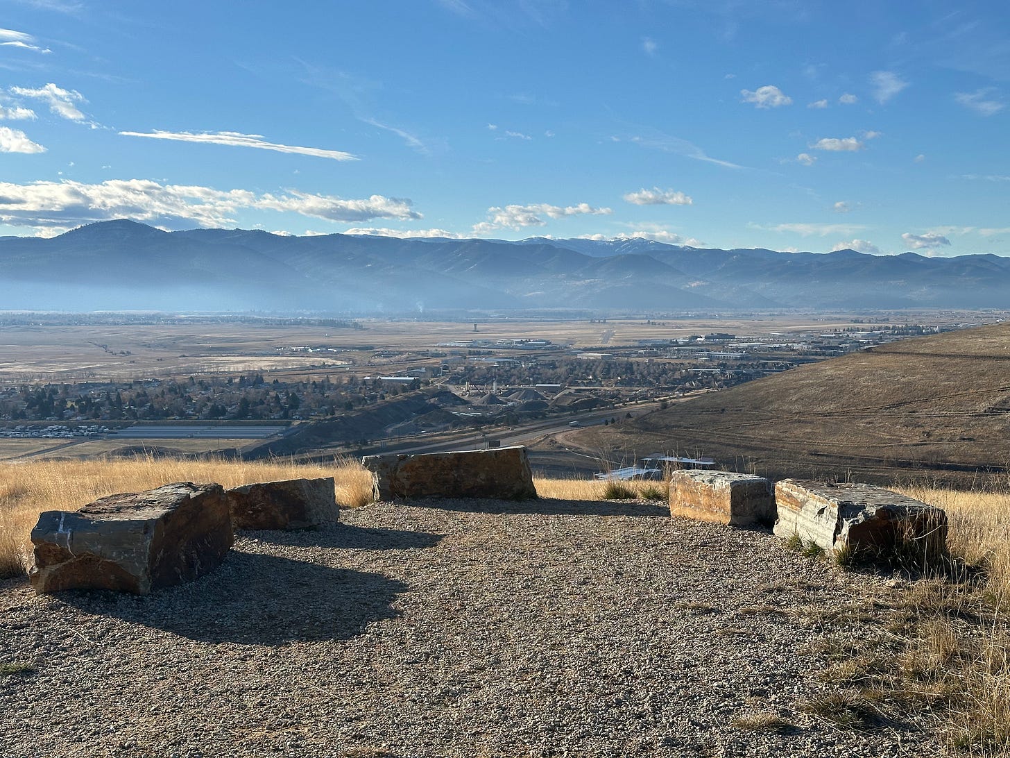 Black Friday; blue skies. A Friday waltz on a trail new, a pleasant piece of public land. It was my first time hoofing it on the Bluebird Trail, rounding the ridges, grooving the mild elevation, and veering off the main trail to check out the scenic overlook indicated by the trailhead signage. I was in the mood for a scenic overlook with a side of seating. And, awaiting any trailgoer, a pleasant horizon and a crescent of rocky bench slabs line the overlook’s endpoint.