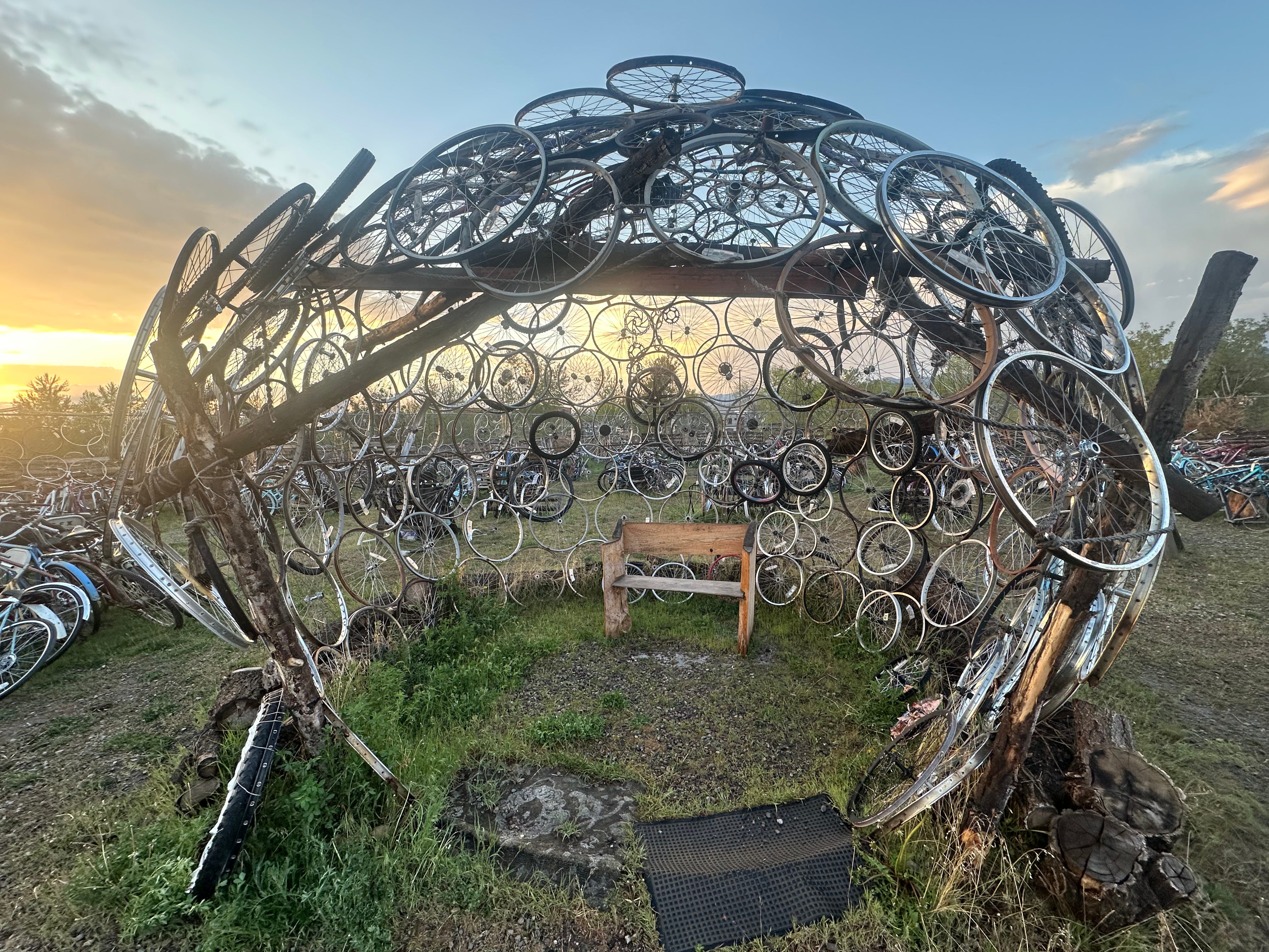 The spring rains swooped in a way that can only be described as an evening squall, which transitioned into a sunset ripe for viewing. Post-rain, wandering in the bike graveyard of Free Cycles, an appropriately infamous Missoula community institution, the Wheel Dome was all shine and shimmer, providing an orb for this wooden construction. Fashionable in the precious Free Cycles way.